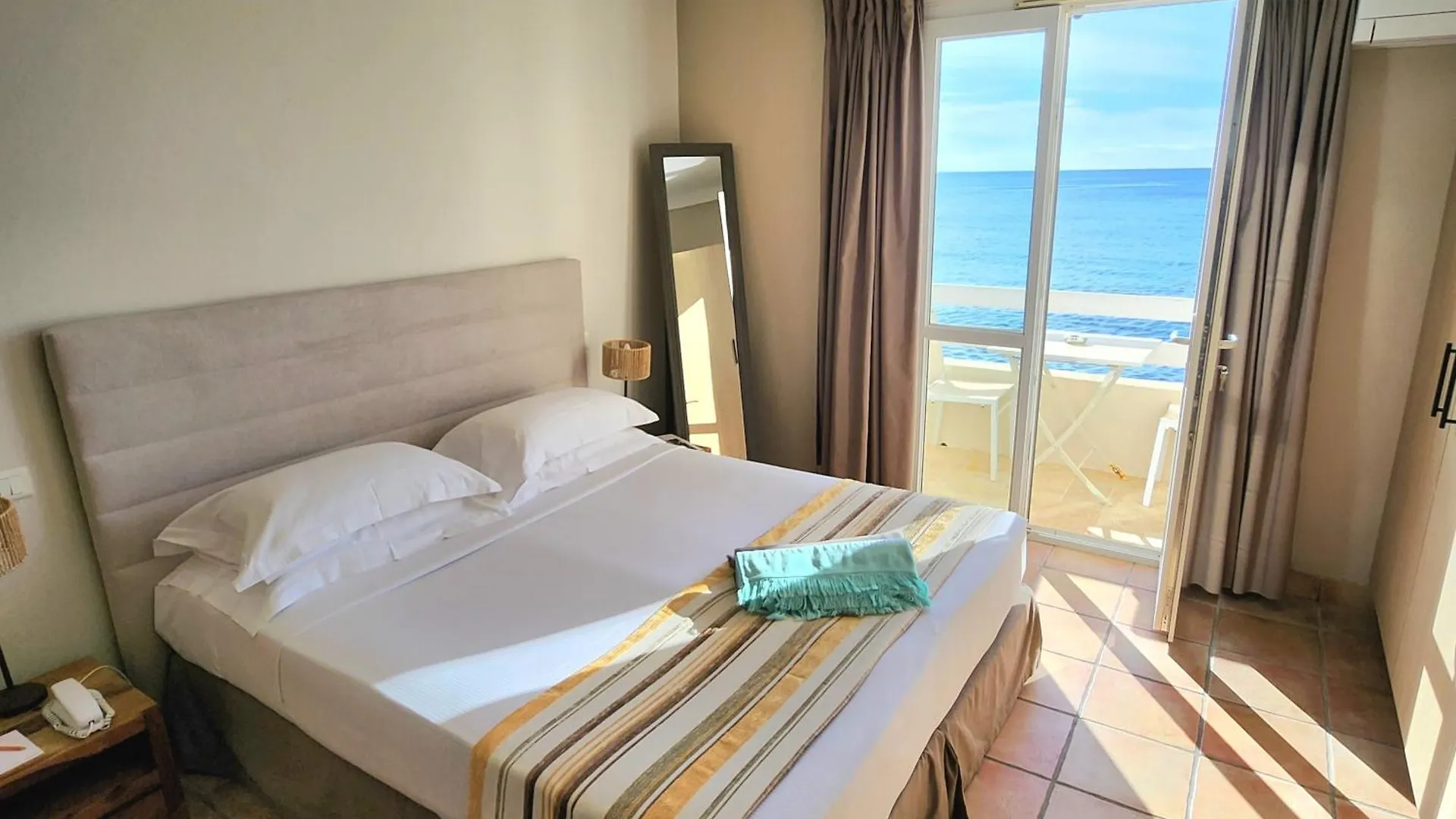 Die Zimmer bieten den Blick aufs Mittelmeer und sind mit einem persönlichen Safe, einem Ankleidebereich und einem Flachbildfernseher mit Satellitenkanälen ausgestattet.